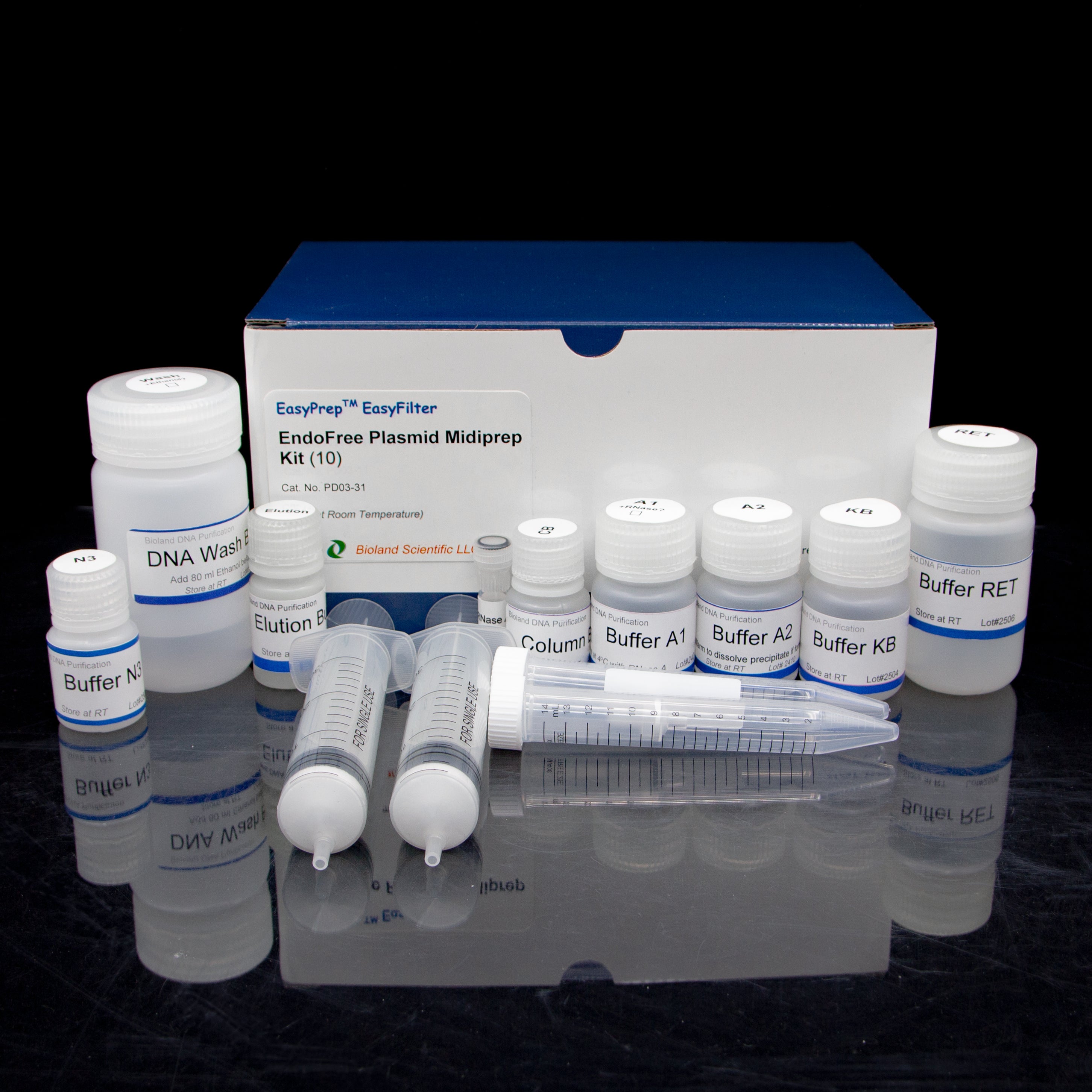 EasyPrep™ EndoFree Plasmid Midiprep Kit provides a simple, fast and cost effective method to purify plasmid DNAs from bacterial culture, when amount of the plasmid DNA needed is about 200 µg. The kit is especially convenient to use when multiple plasmids need to be purified at the same time, as the use of traditional commercial kits is time-consuming.